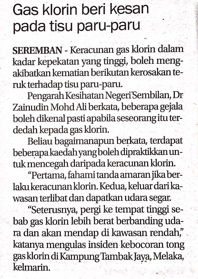 Tajuk :Gas klorin beri kesan pada tisu paru-paru