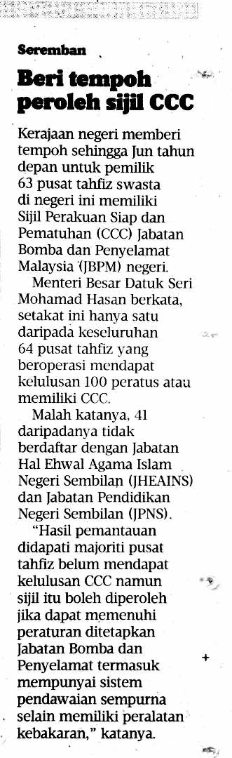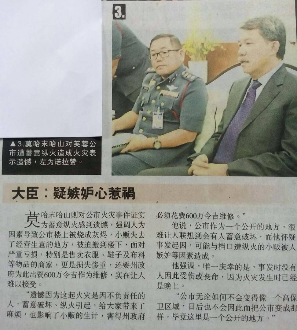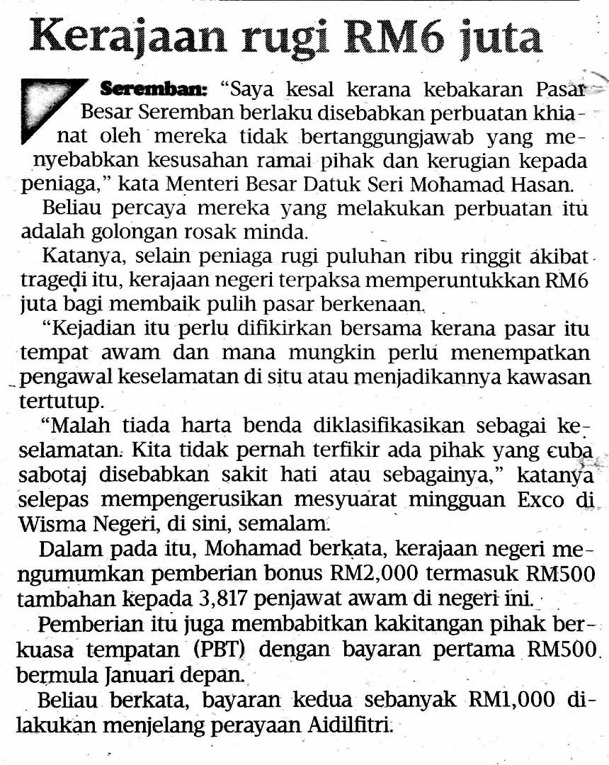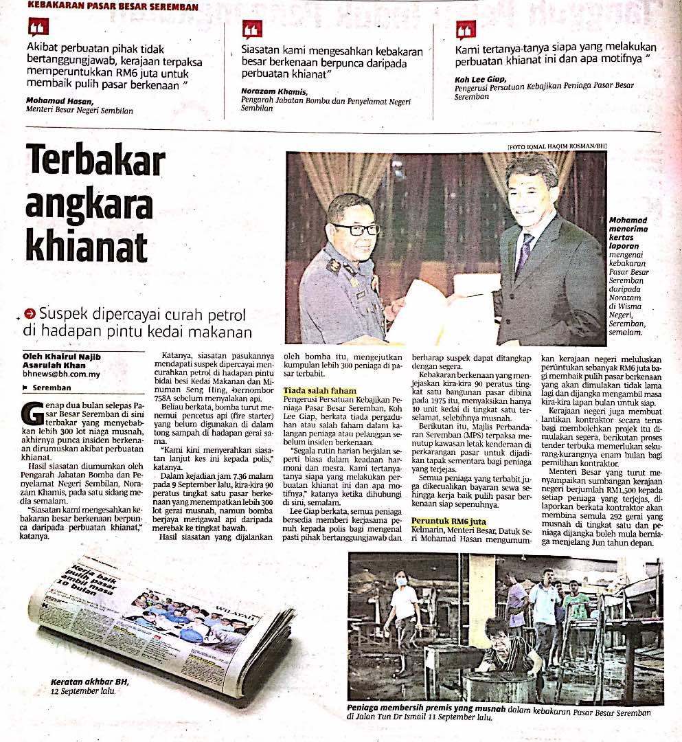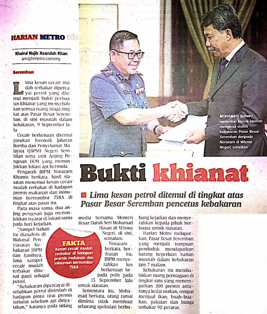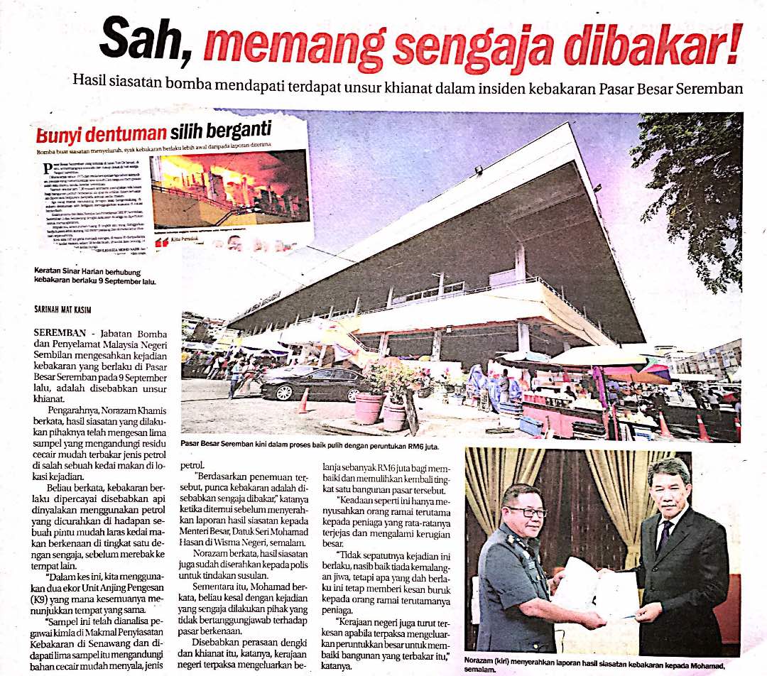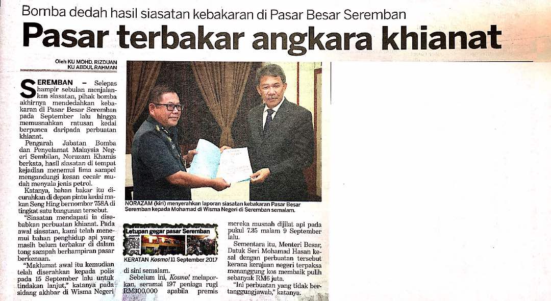 Tajuk :Pengarah Jabatan Bomba dan Penyelamat Malaysia Negeri Sembilan mengesahkan kejadian kebakaran yang berlaku di Pasar Besar Seremban angkara khianat beliau berkata sebelum menyerahkan laporan hasil siasatan kepada Menteri Besar