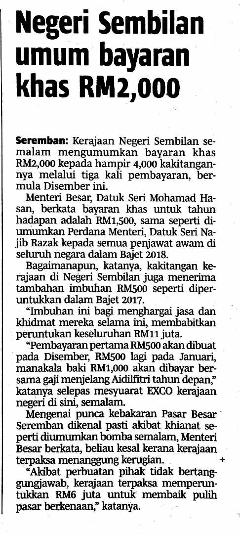 Tajuk :Negeri Sembilan umum bayaran khas RM2,000