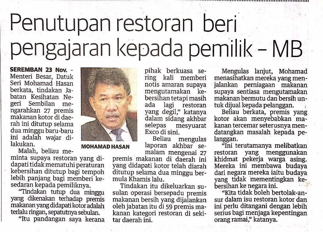 Tajuk :Penutupan restoran beri pengajaran kepada pemilik -MB