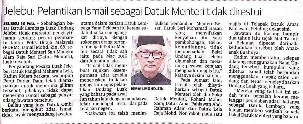 Tajuk :Jelebu , pelantikan ismail sebagai Datuk Menteri tidak direstui