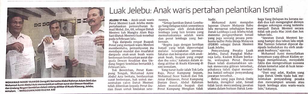 Tajuk :Luak Jelebu: anak waris pertahan pelantikan Ismail