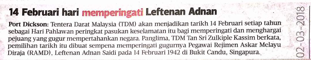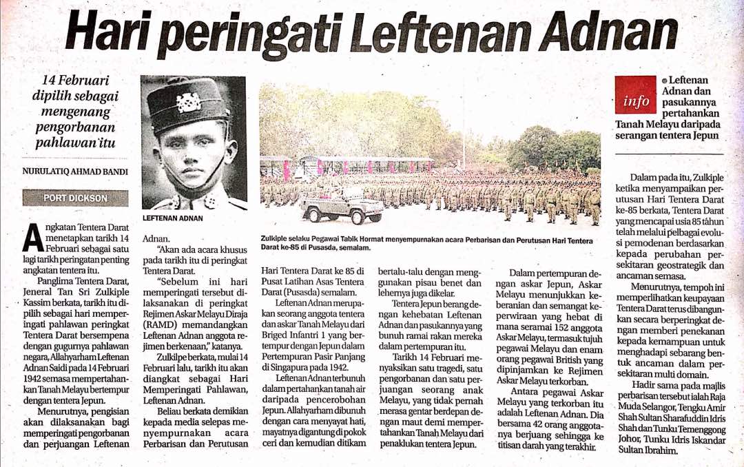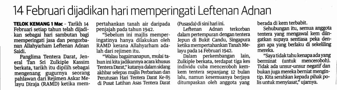 Tajuk :14 Februari dijadikan hari memperingati Leftenan Adnan