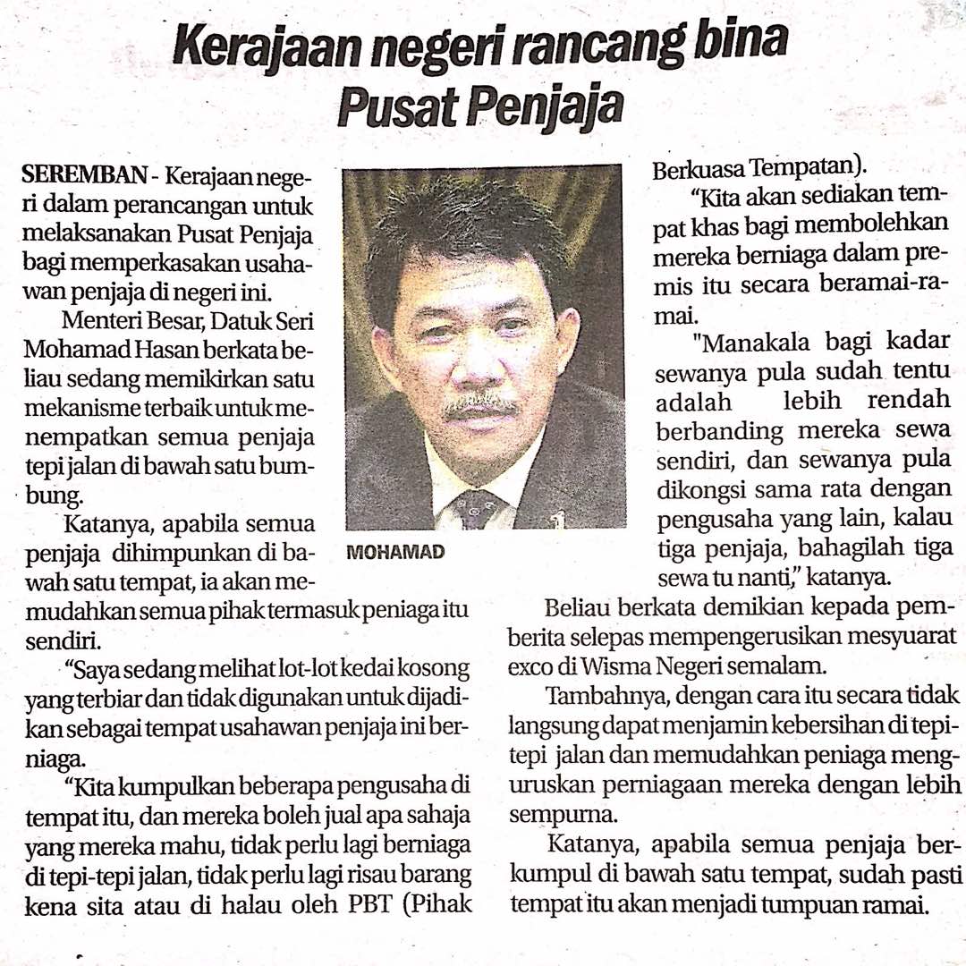 Tajuk :YAB Menteri Besar N.Sembilan mahu supaya industri penjaja diberi imej baru dengan menyewakan lot-lot kedai yang terbiar di sekitar bandar Seremban untuk penjaja majukan dengan lebih baik. Langkah ini dapat menjana ekonomi