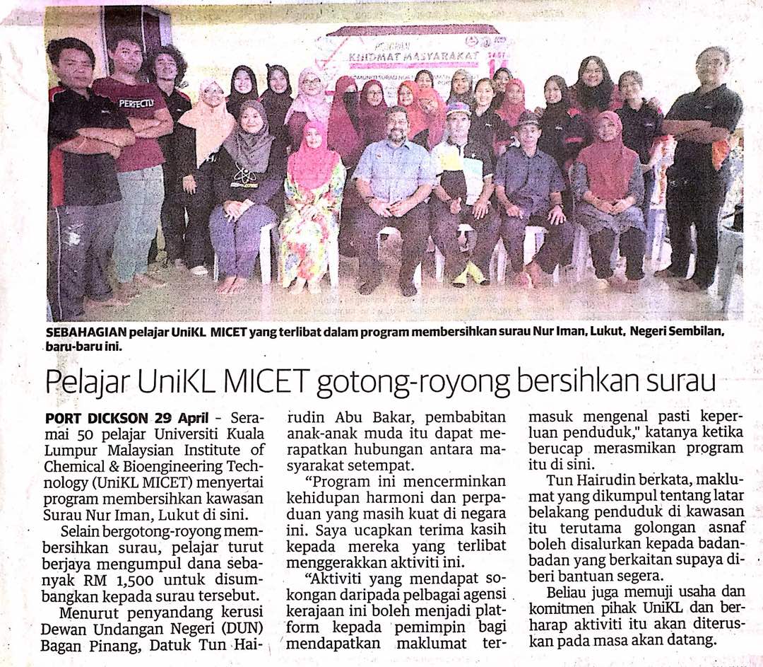 Tajuk :Pelajar UniKL MICET gotong-royong bersihkan surau