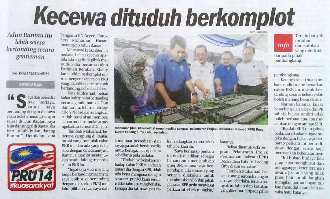 Tajuk : Pengerusi BN Negeri, YAB Dato' Seri Utama Hj Mohamad Hj Hasan merangkap Adun Rantau dah bersedia bertanding dengan calon parti pembangkang dan beliau yakin boleh menang dengan selesa di DUN Rantau. Beliau bercakap semasa Pelancaran Projek Perumahan Rakyat (PPR) di Ladang Kirby, Labu semalam.
