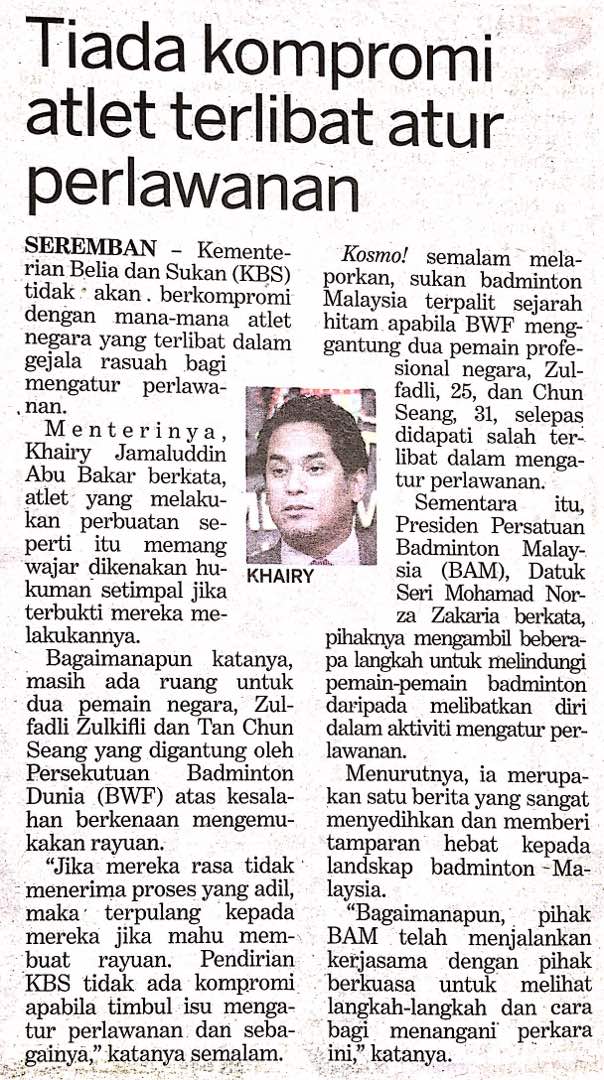 Tajuk :Tiada kompromi atlet terlibat atur perlawanan