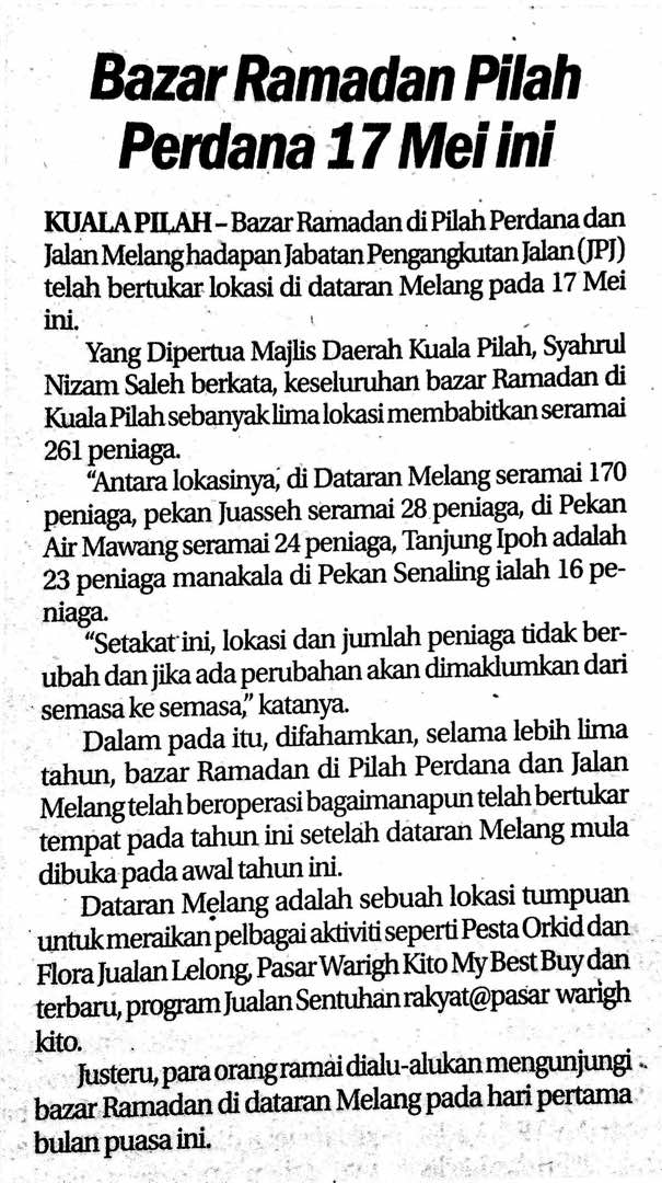 Tajuk :Bazar Ramadan Pilah Perdana 17 Mei ini