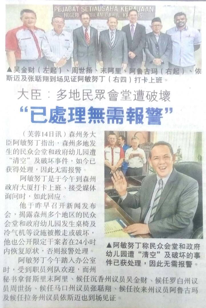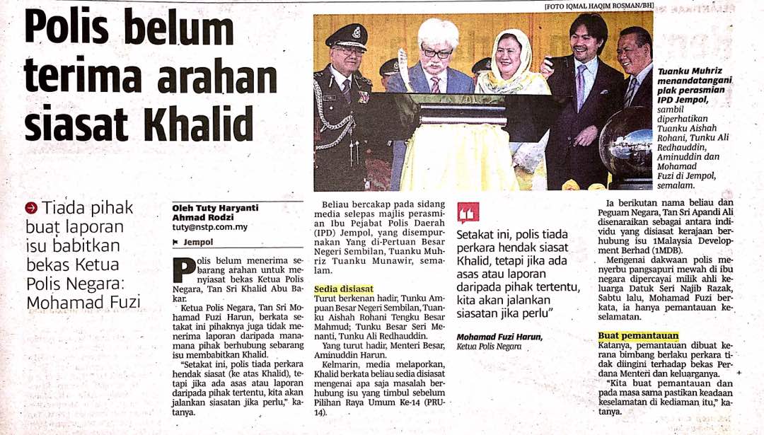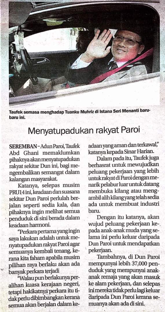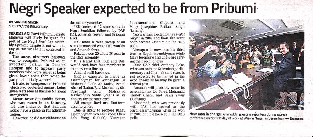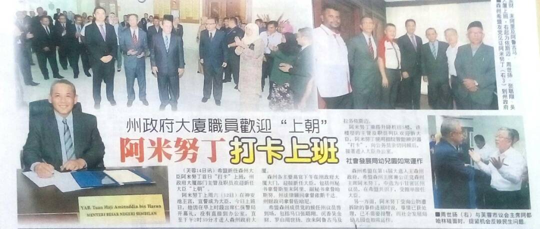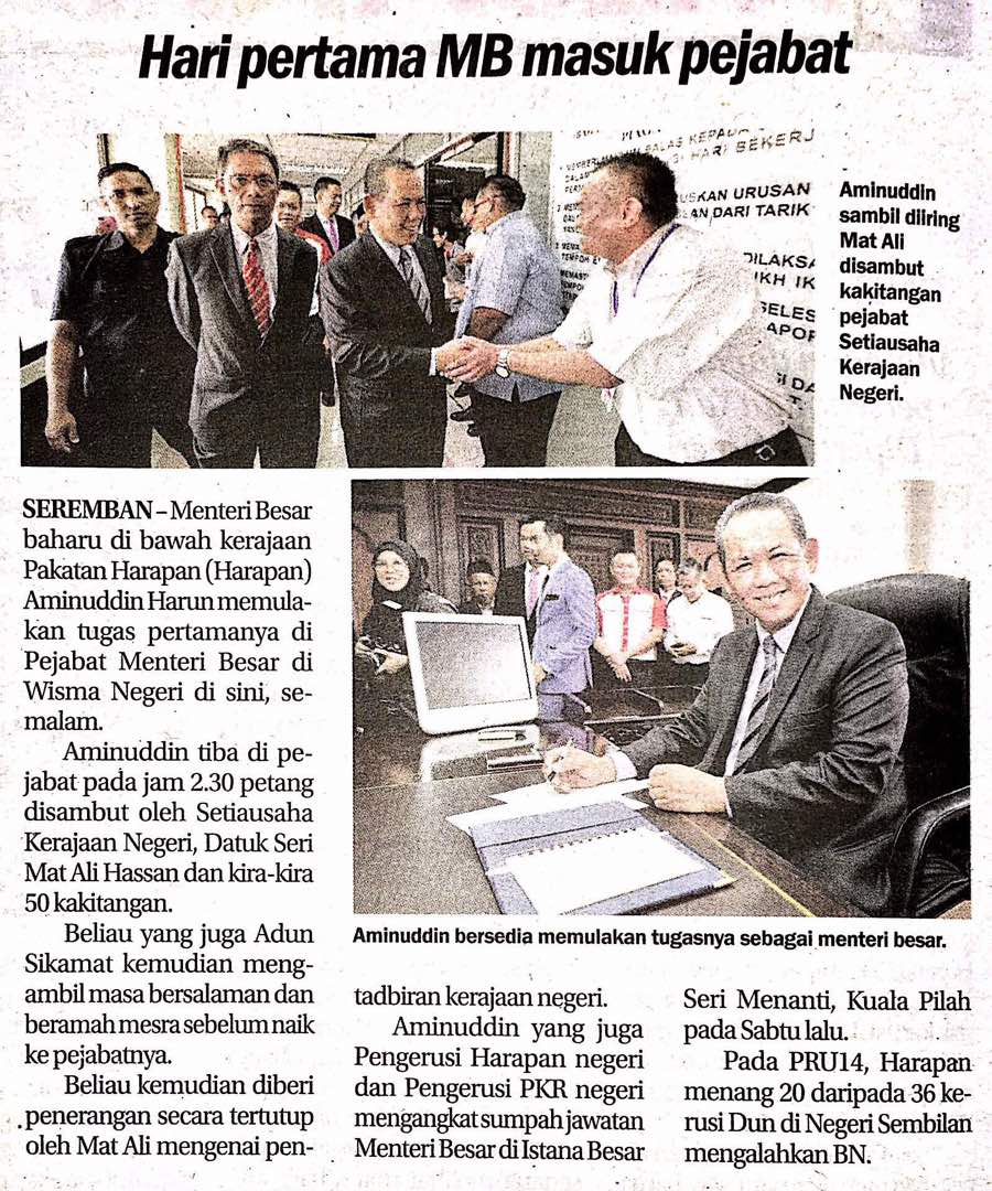 Tajuk :Menteri Besar baharu di bawah kerajaan Pakatan Harapan (PH) Aminuddin Harun memulakan tugas pertama di Pejabat Menteri Besar di Wisma Negeri semalam. Beliau disambut oleh Setiausaha Kerajaan Negeri, Datuk Seri Mat Ali Hassan