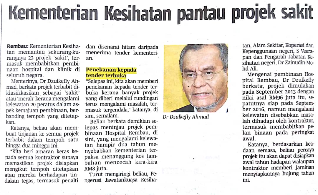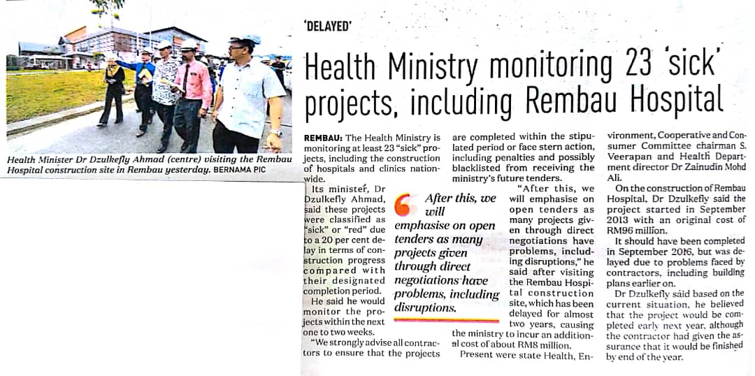 Tajuk :Health Ministry monitoring 23 sick projects, including Rembau Hospital