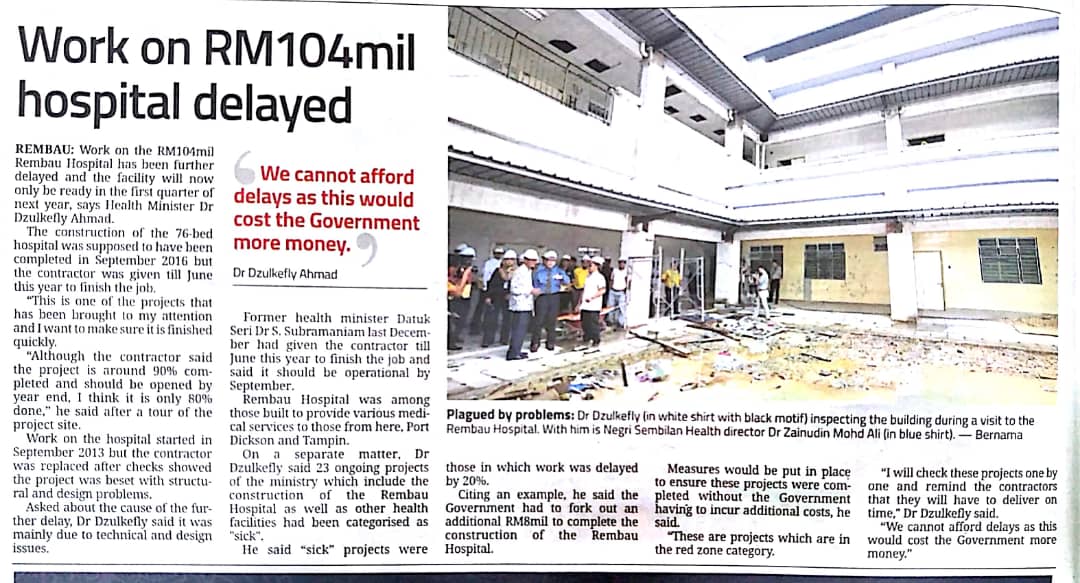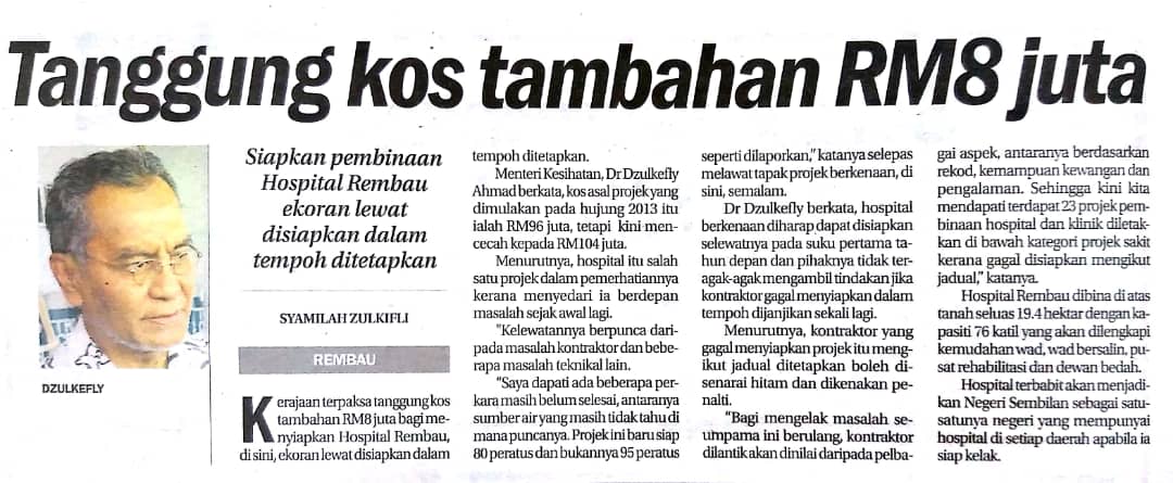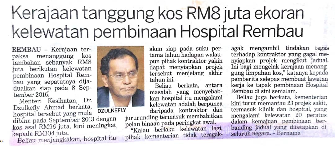 Tajuk :Kerajaan tanggung kos RM8 juta ekoran kelewatan pembinaan Hospital Rembau