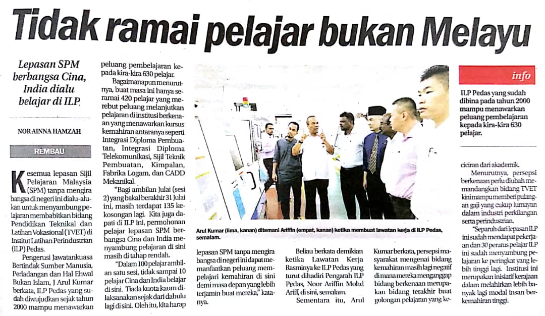 Tajuk :Tidak ramai pelajar berbangsa asing menyambung pelajaran di ILP Pedas meskipun bidang yang ditawarkan amat menarik dan mampu memberi pulangan gaji yang cukup lumayan. Pengerusi Jawatankuasa Bertindak Sumber Manusia, Perladan