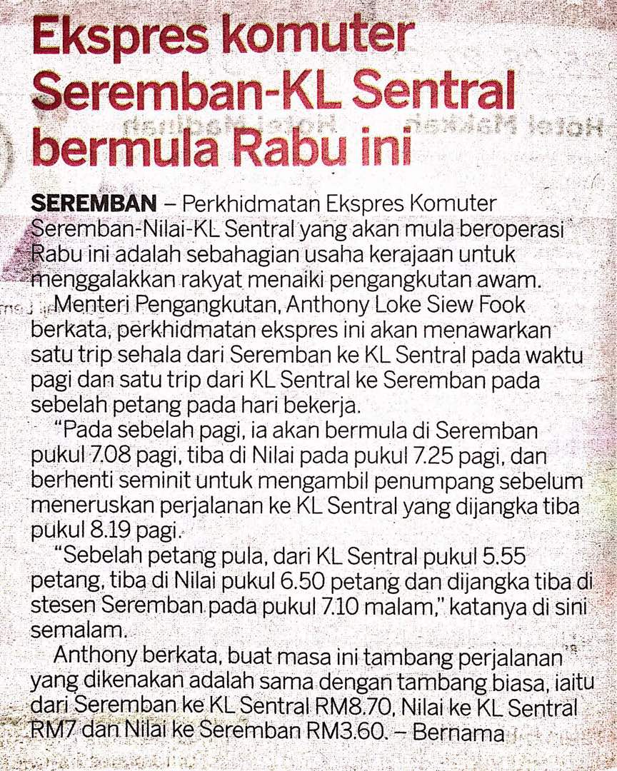 Tajuk :Ekspress komuter Seremban-Kl Sentral mula rabu ini
