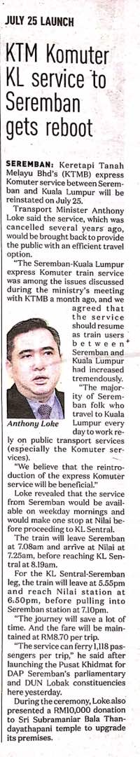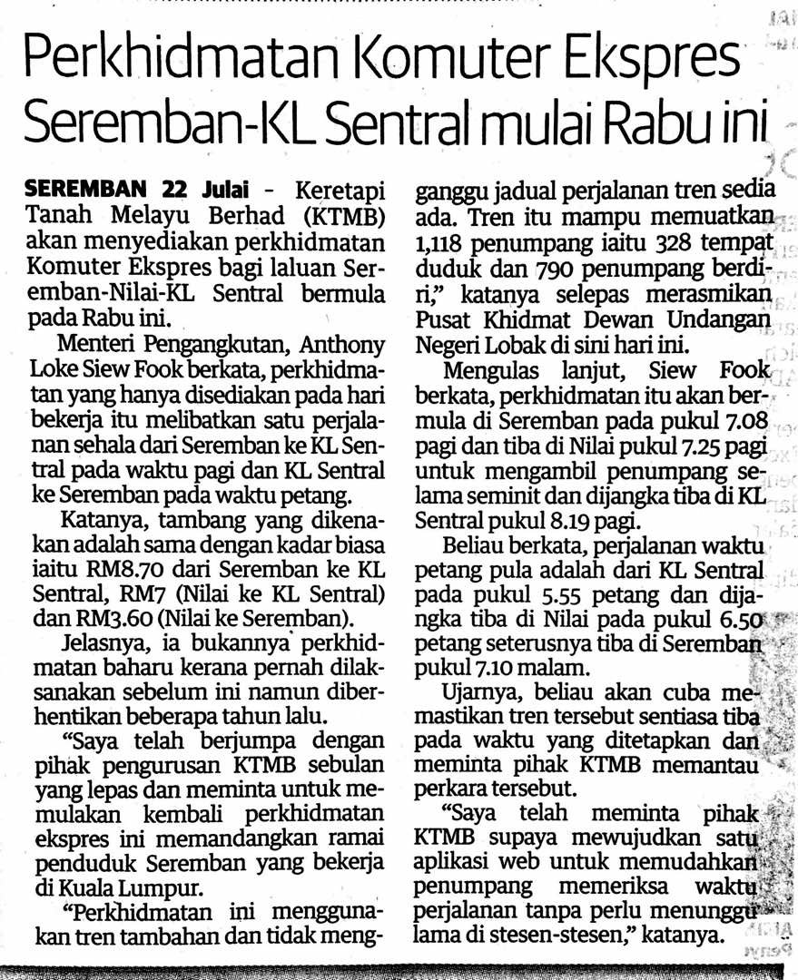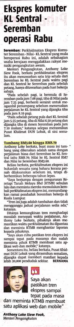 Tajuk :Ekspres Komuter Seremban-Kl Sentral bermula Rabu ini