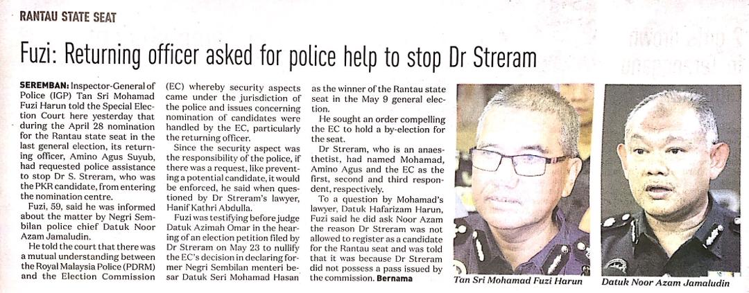Tajuk :Fuzi; Returning officer asked for police help to stop Dr Streram