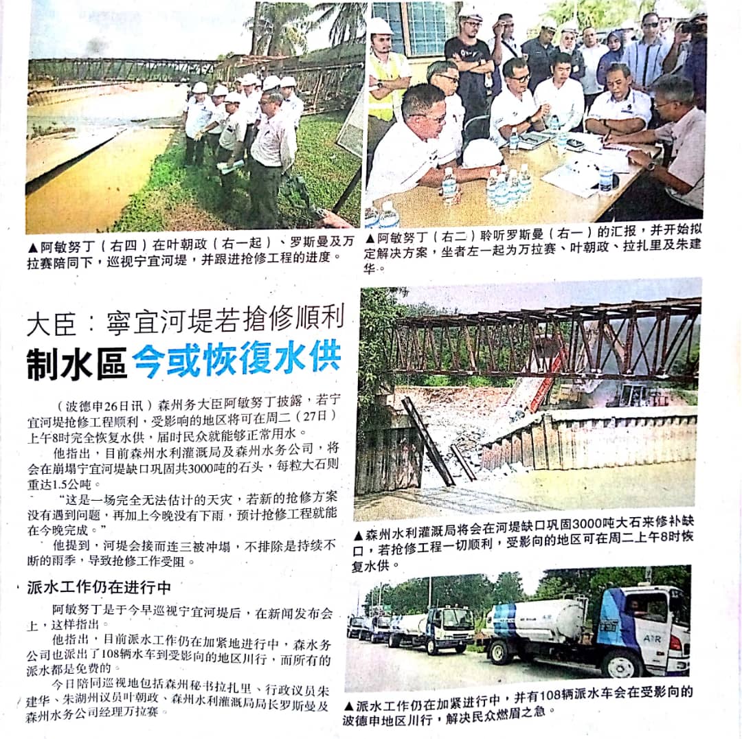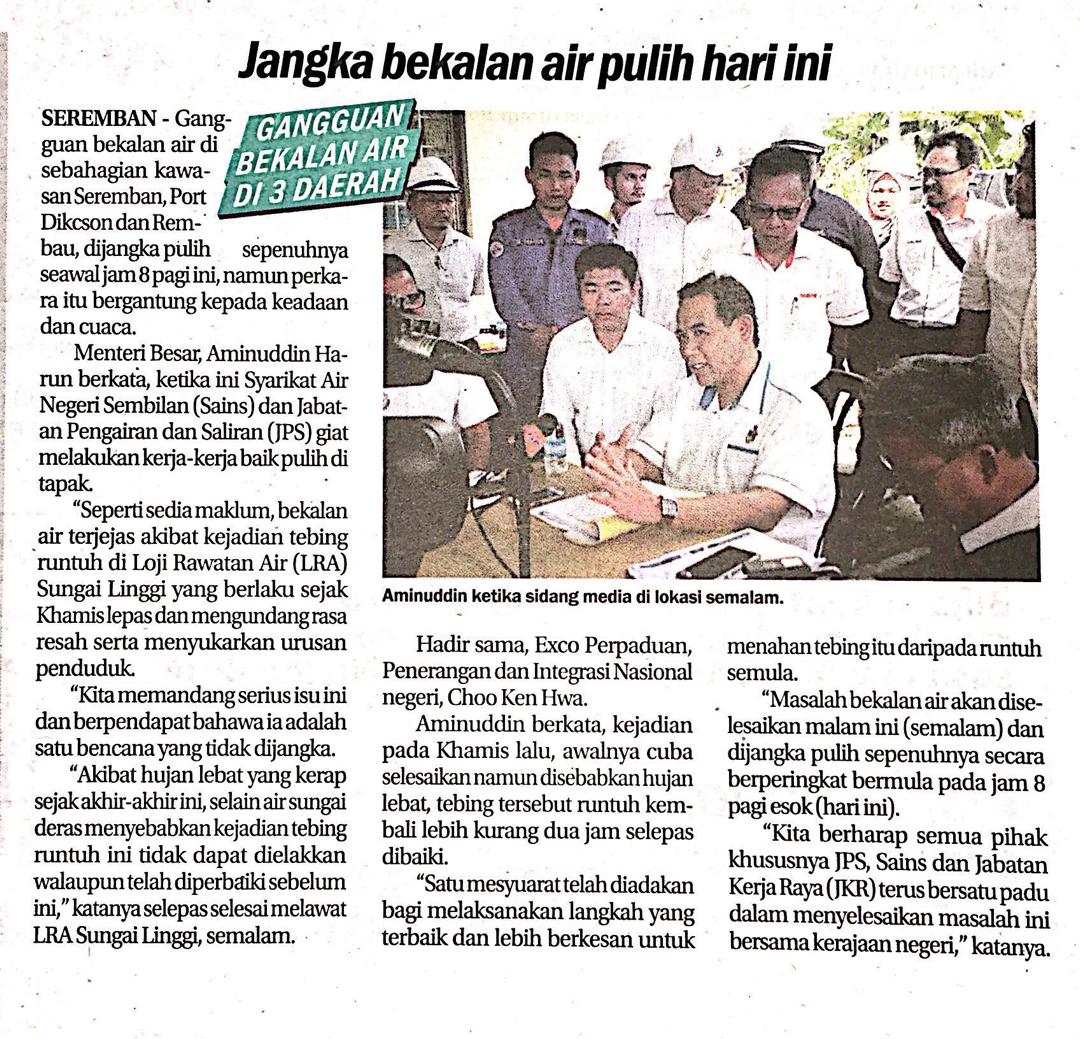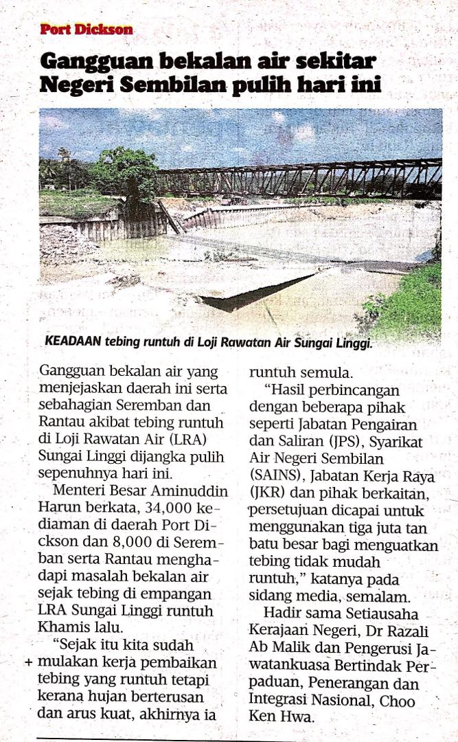 Tajuk :Gangguan bekalan air di sebahagian kawasan dijangka pulih bergantung kepada keadaan cuaca. Bekalan terjejas berikutan kejadian tebing runtuh di Loji Rawatan Air (LRA) Sungai Linggi yang berlaku sejak Khamis lalu